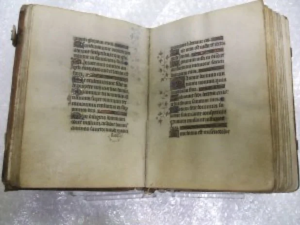 We met in the British Library Manuscripts room where I was given a small box. Inside was a book, no bigger than a paperback novel, but fat, and bound in leather: the Neville of Hornby Hours, made in London in about 1340 for Isabel de Byron, wife of Robert I de Neville. (We’re not allowed to take photos of the manuscripts, but this is a photo of a thirteenth-century book the Ballarat Library kindly allowed me to study.)